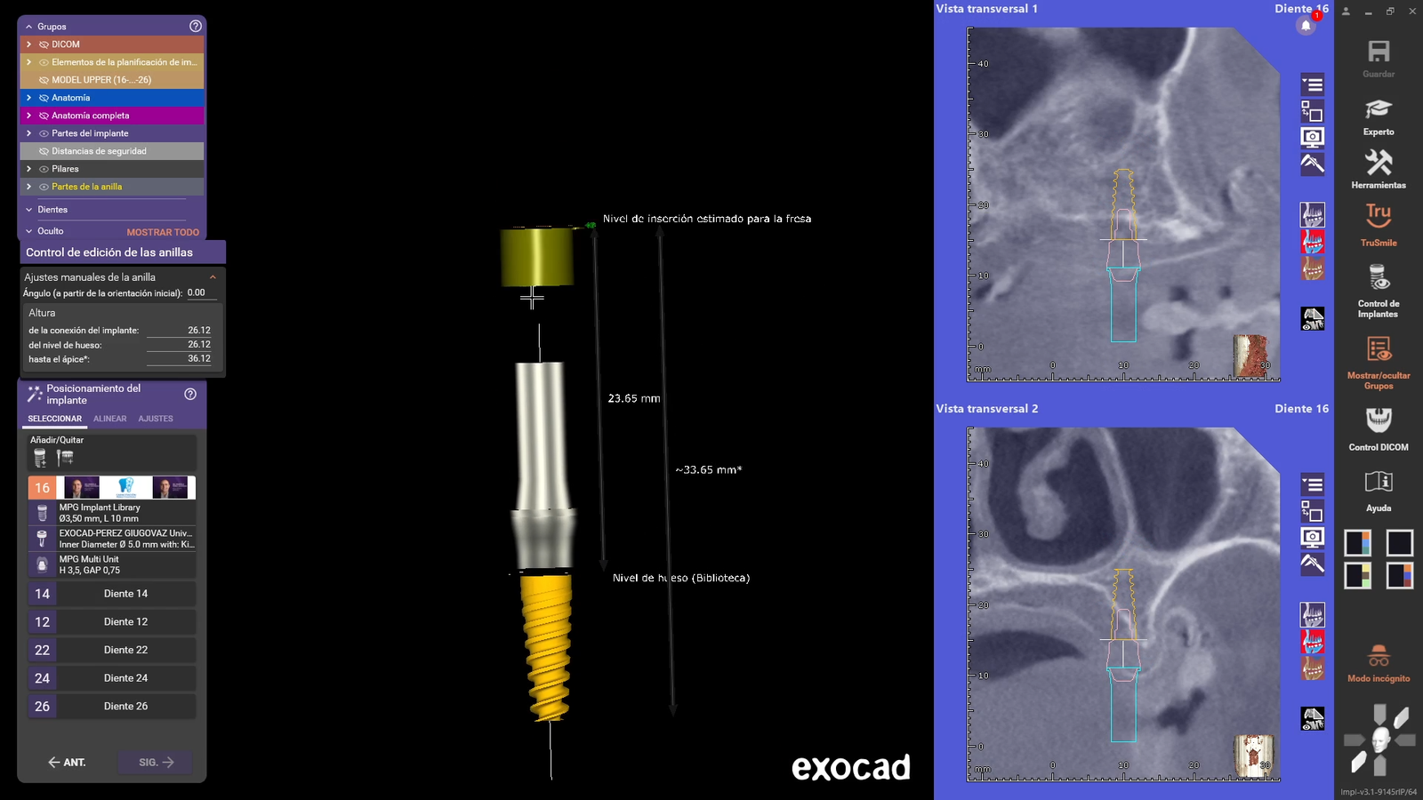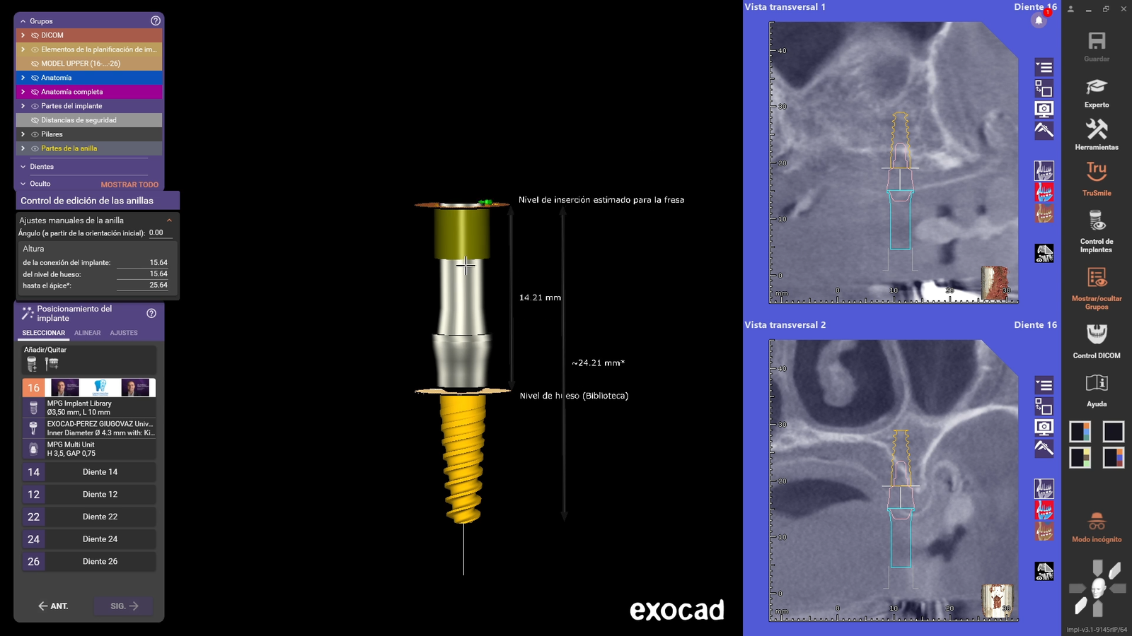 Esta librería de anillas está diseñada para la planificación y creación de guías quirúrgicas en el entorno de Exoplan, con medidas de 4 a 6 mm en incrementos de 100 micras. Su gran ventaja es que permite un desplazamiento libre en altura y un offset ajustable, siendo compatible con todas las marcas de implantes. Es ideal para cualquier kit de guiado, ya que solo necesitas conocer el diámetro de tu fresa o anilla de titanio. Esta herramienta genera los orificios precisos en la guía, facilitando la inserción de la anilla o fresa para un proceso quirúrgico más eficiente y preciso.